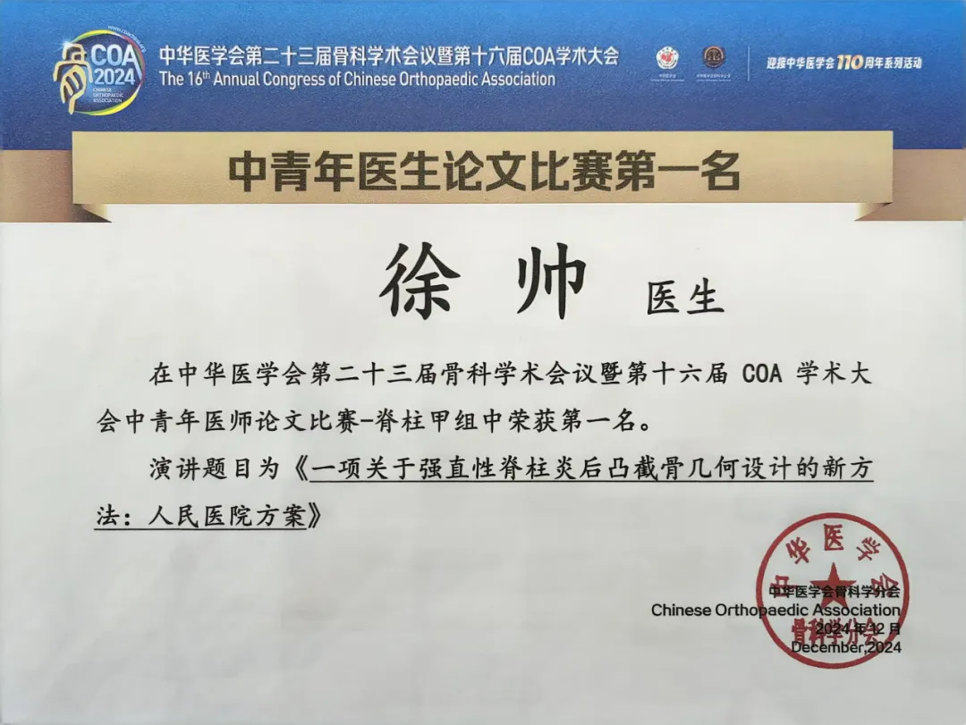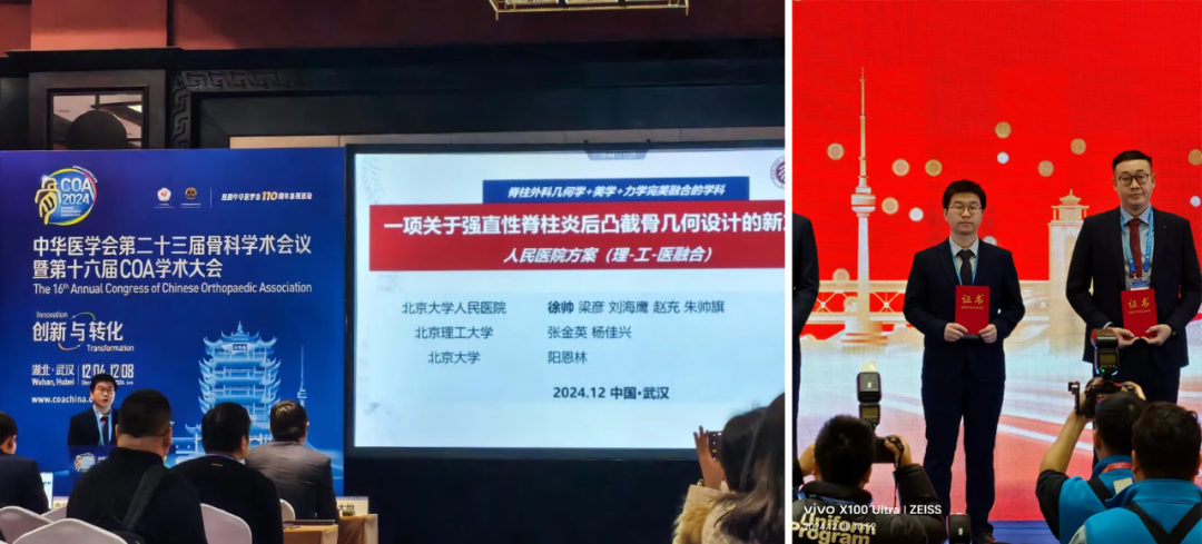 在北京大学人民医院脊柱外科刘海鹰教授和曾岩教授的指导下,科室徐帅医生课题组与北京理工大学张金英教授团队、北京大学阳恩林教授团队联合,设计了一种关于AS后凸截骨几何设计新方案(简称“人民脊柱方案”),实现了医学和理工科学完美融合。在2024年第十六届COA学术大会上,徐帅医生全面围绕“创新与转化”这一主题,代表团队系统地介绍了“人民脊柱方案”的核心内容,并凭借该方案的创新性和实用性,在一众中青年医师论文参赛选手中脱颖而出,荣获脊柱专业第一名。