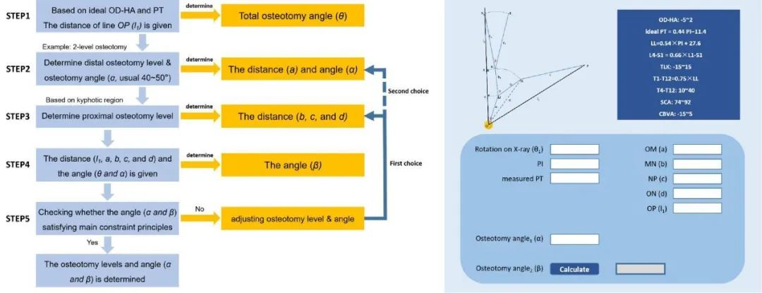 徐帅课题组认为当前对于AS截骨矫形术前规划仍较为复杂且难以量化,团队在总结学习大量前人经验的基础上,通过反复临床实践,提出以下思考:(1)AS患者最终是要恢复整体平衡、重建局部序列和视觉满意三个重要条件,那么满足三个条件的指标是什么?(2)整体平衡重建的前提是恢复骨盆中立位,如何通过X线上矢状位参数和最终平衡参数计算躯干总体旋转(以股骨头为旋转中心)角度?(3)躯干总体旋转角度与截骨位置和截骨角度(以双节段截骨为例)密切相关且必然存在几何关联,如何通过函数运算建立局部与整体的关系是本方案面临的关键理论问题。(4)如何将算法隐藏且只需要为专科提供简便清晰的操作界面?(5)在上述基础上,如何将操作界面升级转化为软件平台,进一步体现该方案的一站式运算优势,这是本方案需解决的关键技术问题。
