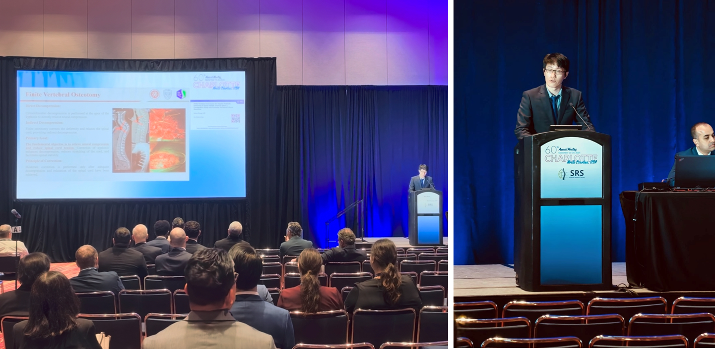 在曾岩主任的指导下,张家豪博士做了题为Finite vertebral osteotomy for angular kyphotic deformity in upper-middle thoracic spine: a comparative study with posterior vertebral column resection的报告。针对角状后凸畸形这一脊柱外科疑难病症创新性地提出了“有限截骨矫形”理念,针对中上胸椎角状后凸畸形顶点进行环形减压和有限截骨矫形,在获得良好矫形效果的同时,显著降低手术创伤,减少了围手术期并发症和术后远期机械性并发症,综合疗效优于传统椎节切除截骨。该报告引起了与会专家学者的极大兴趣和高度评价。