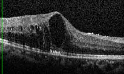 眼科的光学相干断层扫描(OCT)是一项无创的眼科检查,它对于早期发现糖尿病引起的黄斑水肿是非常有帮助的,往往比医生的肉眼判断更为准确。对于一些有视力下降或者视物变形的病人,如果怀疑存在黄斑水肿,OCT检查是必须的