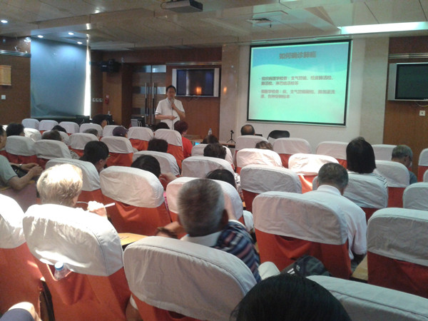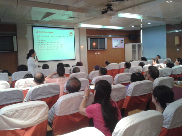 2015年7月22日下午14时,北京大学人民医院门诊5楼报告厅呼吸内科肺癌的健康教育讲座正在进行。这次肺癌健康教育讲座主题是“肺癌的治疗及随访”和“肺癌患者的营养支持”。60余名患者前来参加。