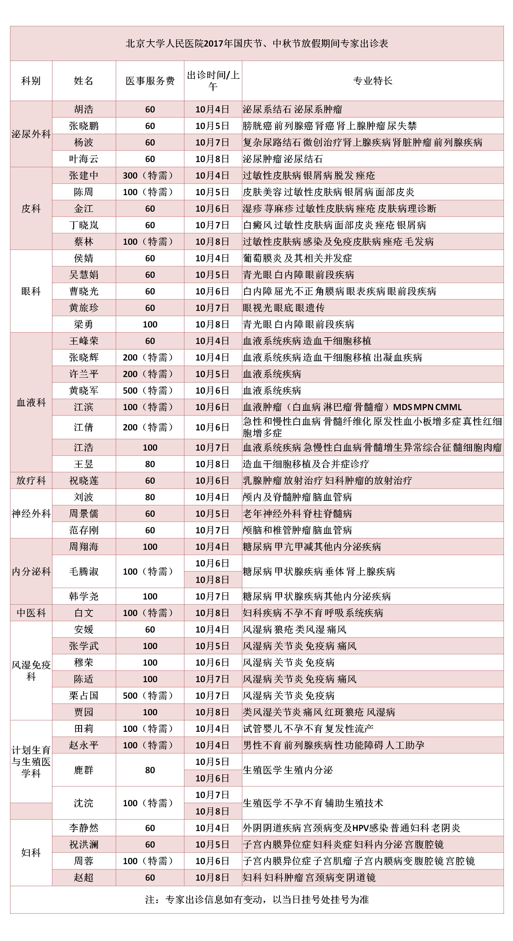 2017年10月1日至10月8日放假调休,此期间10月1日至10月3日不安排门诊,10月4日至10月8日上午均开设半日门诊。其中10月4日、10月8日均按周日出诊,10月5日至10月7日均按周六出诊,9月30日(周六)按周五出诊。具体专家出诊安排请参阅《2017年国庆节、中秋节放假期间专家出诊表》。
