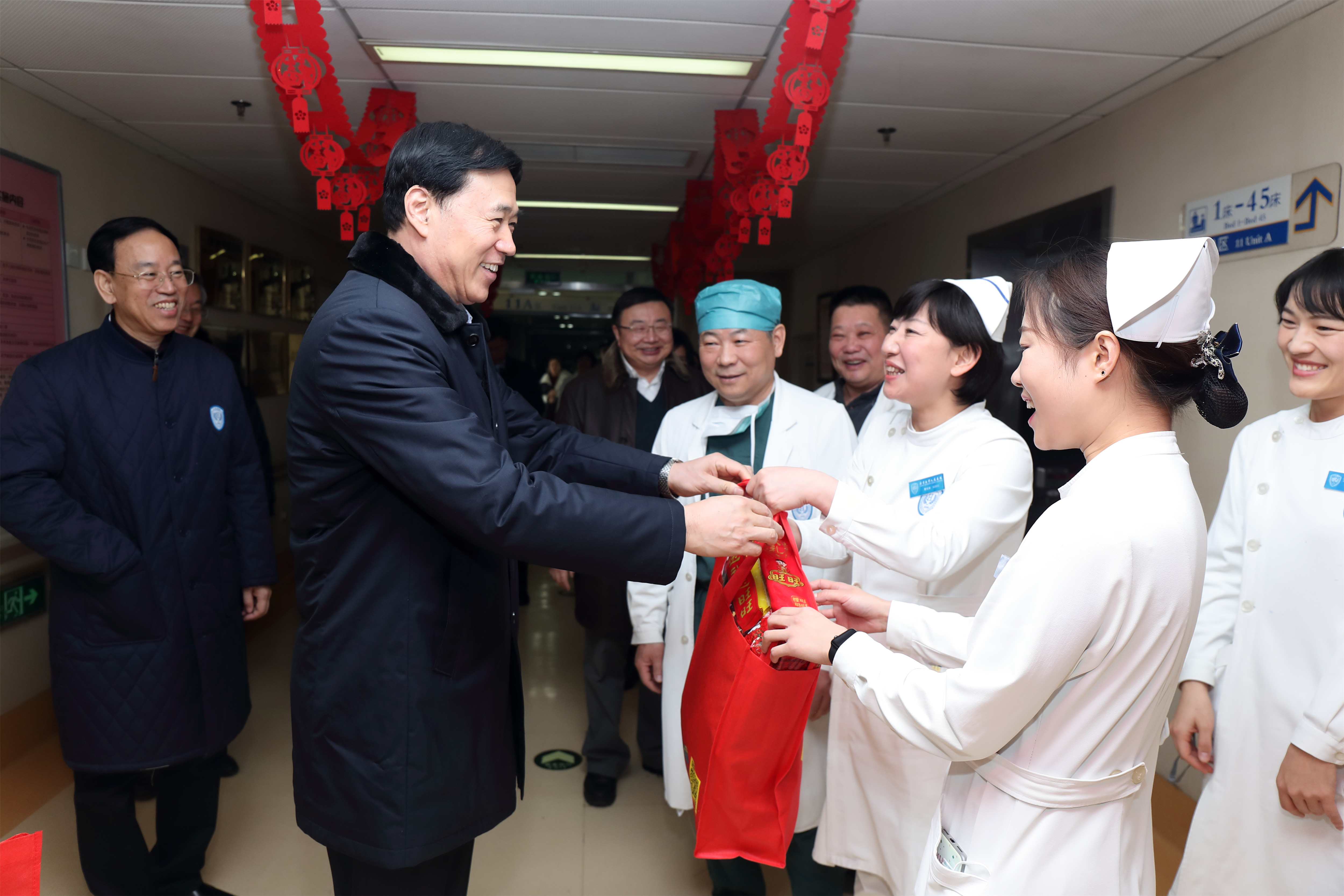 北京大学党委副书记、医学部党委书记刘玉村,北京大学医学部副主任王维民、刘晓光,医学部党委副书记朱树梅,医学部党委宣传部部长焦岩,在北京大学人民医院姜保国院长、党委赵越书记、张俊副院长、刘玉兰副院长、王建六副院长、李澍副院长、党委陈红松副书记、郭静竹副书记、纪委苏茵书记的陪同下,先后来到风湿免疫科和骨肿瘤科病房,为临床一线医护人员送去新春祝福。