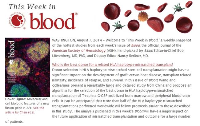 近日,北京大学血液病研究所黄晓军教授在国际血液学领域的顶级学术期刊《Blood》(影响因子9.775)发表关于“单倍型造血干细胞移植供者优化选择”的研究论文。该成果发现了单倍型移植供者的“优化选择法则”,可有效降低移植合并症发病率,提高患者生存率。该论文被选为《Blood》当期封面焦点文章(Plenary Paper),由主编Bob Löwenberg教授在卷首“This Week in Blood”特别推荐,并授权免费获取全文。