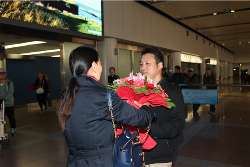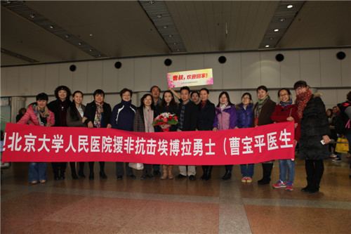 2014年11月15日清晨,北京大学人民医院曹宝平副主任医师圆满结束几内亚抗埃博拉工作回国。由党委书记陈红带队,北京大学人民医院的迎接队伍早早地等候在了首都机场。大家在机场拉起了横幅,热切地翘首企盼抗击埃博拉英雄的凯旋。终于,英雄出现在了出口,机场顿时响起了热烈的掌声,英雄立刻被鲜花和拥抱包围。