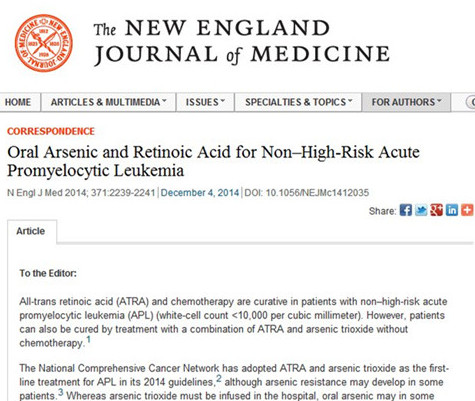 近日,北京大学血液病研究所在急性早幼粒细胞白血病(APL)的临床研究方面取得重大进展。2014年12月4日,国际医学顶级杂志《新英格兰医学杂志》(New England Journal of Medicine,影响因子54.42) 以通信形式发表北京大学人民医院、北京大学血液病研究所主鸿鹄、黄晓军为作者的临床研究成果:“口服砷剂和维甲酸治疗非高危急性早幼粒细胞白血病”[Zhu HH, Huang XJ,Oral Arsenic and Retinoic Acid for Non–High-Risk Acute Promyelocytic Leukemia,New England journal of medicine 2014,371(23):2239-2241]。这是该研究团队今年在《新英格兰医学杂志》发表的第2篇系列研究文章。