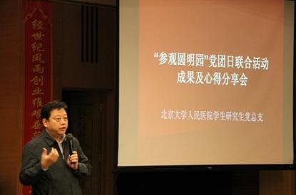 2013年10月15日下午5点半,北京大学人民医院学生研究生党总支“参观圆明园”主题党日活动成果心得分享及全国道德模范贾立群医生的先进事迹学习活动在科教楼三楼多功能厅召开。特邀院党委副书记陈红松参加此次分享会。