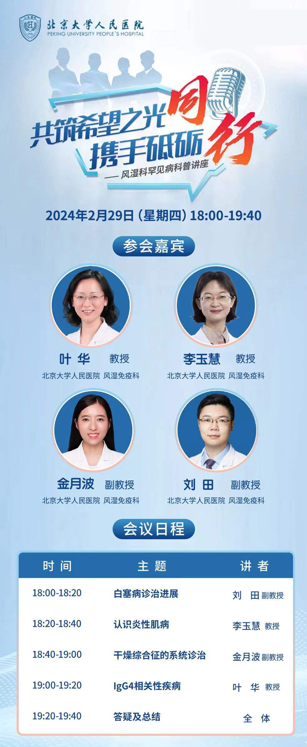 为了提高公众对风湿免疫病中罕见病及罕见病群体的认知,推进罕见病科普宣传,帮助罕见病患者及时诊断治疗,提高生存质量。2月29日晚上,北京大学人民医院风湿免疫科党支部牵头举办了“国际罕见病日”线上患者宣教活动。叶华主任医师、李玉慧主任医师、刘田副主任医师和金月波副主任医师分别就“IgG4相关病”、“炎性肌病”、“白塞病”及“干燥综合征”等四种罕见风湿病的疾病概况、最新治疗进展及患者的自我管理等方面进行了通俗易懂又不失专业的讲解,最后几位医生对患者提问进行了集中答疑。患教活动得到了患者的积极响应和广泛参与,据统计,当晚有2000余人在线观看直播。