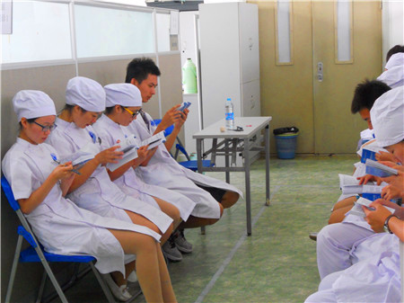 医学是患者“健康所系、性命相托”的一个职业,因此挑选人才的标准必须严格、谨慎。并不是每一个“订单”都能高枕无忧进入北京大学人民医院实习,每一名学员都是经过层层选拔的。北京大学人民医院护理部张海燕副主任介绍了订单培养护理学生的流程:北京大学人民医院教育处、护理部、临床各专业的专家每年都在学生的一年级第二个学期去订单培养合作学校挑选学生。这是一个双向选择的过程,合作学校通知一年级的学生报名,北京大学人民医院的专家考察报名学生各方面的成绩和表现,最后通过面试的学生组成“人民班”。学生二年级在学校进行专业课的培训,其中部分课程,特别是在技能训练时结合人民医院的操作要求和规范进行培养、训练。由于大多数学校都已经有老师到北京大学人民医院进修过,因此对医院的法律、人文环境、道德规范都比较熟悉,能够按照人民医院的要求对学生进行相关指导。第三年北京大学人民医院的专家再通过考察学生的动手能力、理解能力、可塑性等素质挑选符合要求的订单班学生和其他班优秀的学生来人民医院实习。每年7月,通过考核的学生来到北京大学人民医院实习。在进入临床实习前,还要先进行2周的集中训练,训练之后进行技能、理论考试,考试合格之后才能进入临床实习。
