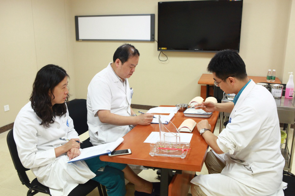 各基地充分利用临床技能中心的场地和设备优势,开展模拟技能训练和CPR培训,进行技能认证,此外医院还开设了动物手术课程,对于部分因术式变化而减少的病种病例,通过模拟训练和动物手术完成住院医师的技能训练。