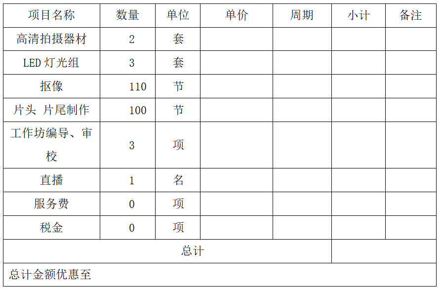 ②包含单价及总价的报价单(为方便报价,请按照以下统一格式,但不仅限于此些种类