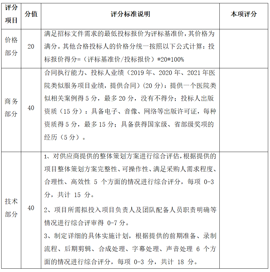 2、评标委员会将按照采购文件的有关规定和有关法律法规的规定,本着公平、公正、科学、择优的原则,对初步审查合格的投标进行以下各方面的综合评议。每个评委独立评分,所有评委评分的总分,即为每个投标人的最终得分。若总得分相同的,按价格部分得分顺序排列。