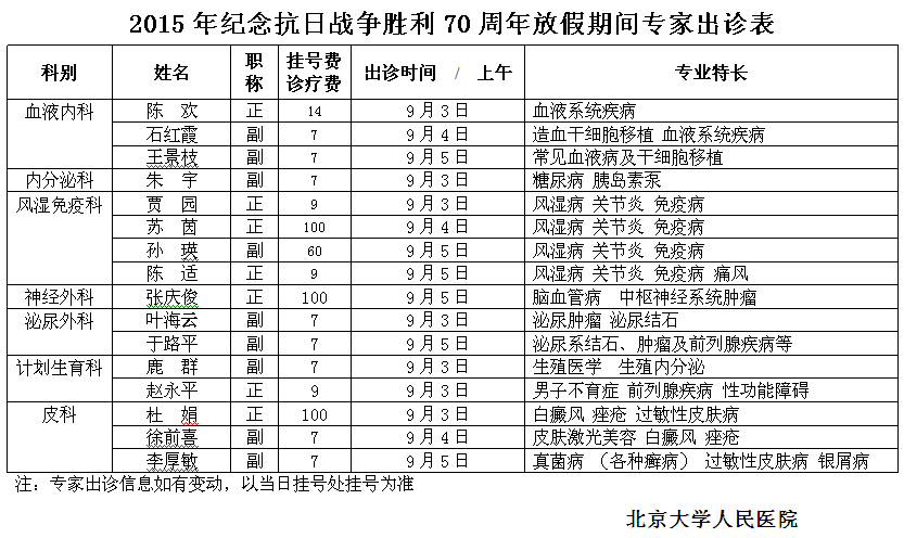 北京大学人民医院2015年纪念抗日战争胜利70周年放假期间专家出诊表