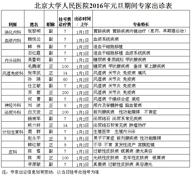 元旦专家出诊表