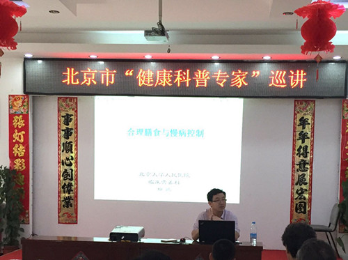 2015年7月27日,应北京市疾病预防控制中心健康教育科邀请,北京大学人民医院临床营养科副主任营养师柳鹏博士,为石景山区模式口西中社区的居民朋友们带去了一场主题为“合理膳食与慢病控制”的健康讲座。讲座吸引了众多社区居民及社区领导的参与,共计40余人参加了健康讲座。