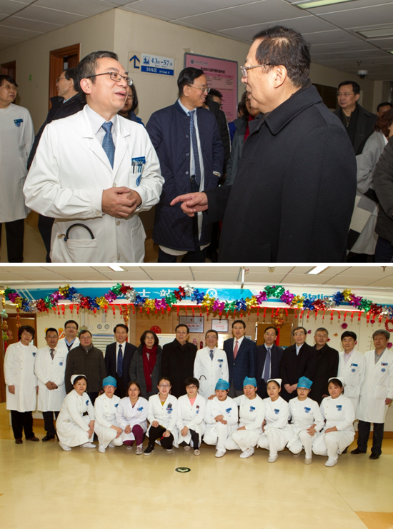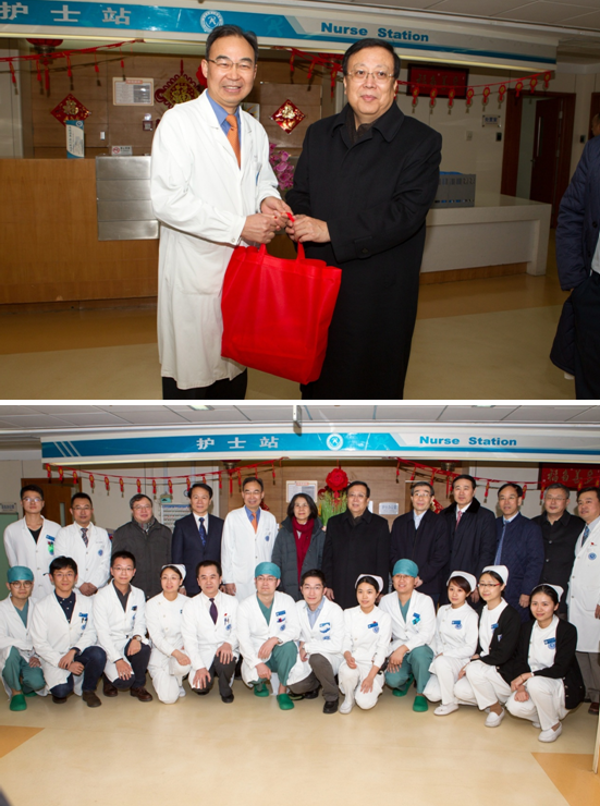 北京大学党委书记郝平,常务副校长柯杨,党委副书记敖英芳,副校长、总务长王仰麟,理学部主任饶毅,两办主任郭海,党委组织部部长柴真,学科建设办公室副主任张存群;北京大学医学部主任詹启敏,党委书记刘玉村,副主任、两办主任肖渊等领导,在北京大学人民医院院长姜保国,党委书记赵越,副院长张俊、刘玉兰、王建六、李澍,党委副书记陈红松、郭静竹,院长助理王天兵的陪同下,先后来到胸外科、血液病研究所和急诊科,为临床一线医护人员送去新春祝福。