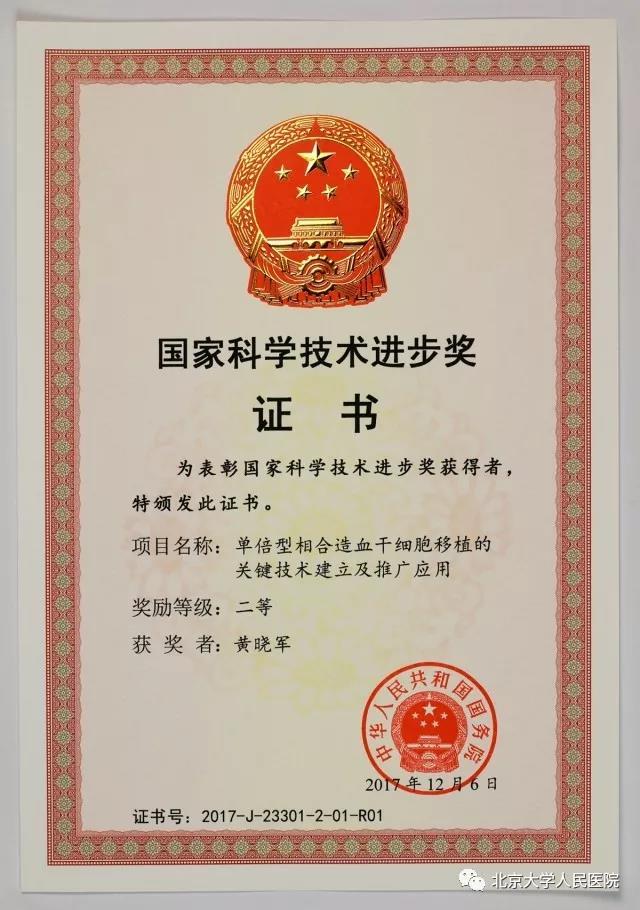 此次获奖是继2014年“异基因造血干细胞移植后复发及移植物抗宿主病防治体系建立与应用”项目获得国家科技进步二等奖之后,黄晓军团队再次获得该项奖励。