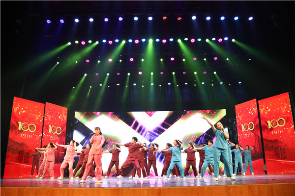 医院退休职工与青年员工表演的快板展现医院发展,相声演员李伟健与医院职工搭档表演相声,讲述人民医院全力救治病患的温情故事。男高音歌唱家王宏伟一曲《口碑》唱出人民医院人最朴素的心声——金奖银奖不如老百姓的夸奖,金杯银杯不如老百姓的口碑。女高音歌唱家刘媛媛带来曾在国庆60周年晚会上演唱的代表作《国家》,道出人民医院全体职工爱国爱党、坚定信仰的满腔热情。医院年轻人酷炫动感的歌舞表演《欢乐颂》,唱不尽人民医院人此时此刻愉悦的心情,舞不尽百年历史的绚丽风采。急诊医务工作者真实故事改编的音乐剧《医者仁心爱永恒》,一曲《时间都去哪了》触动心弦,白衣天使在救死扶伤背后的亲情。情景剧《社会谣》用快闪和唱跳的形式展现医务工作者繁忙的工作、丰富的生活,崭新笔挺的新工装闪亮登场。舞蹈串烧表演《大爱无疆》展现近年来医院医疗队、援藏援疆专家、走过祖国的贫困山区、边远村寨;援非专家,在非洲贫瘠荒原上以满腔热血救死扶伤的大爱无疆。2017年获医院“111”人才学科规划资助、出国培训学习的103位护士长表演了配乐诗朗诵《护士之歌》,展现白衣天使用自己的爱心和双手,每天默默地奔忙,为患者驱赶病痛,抚平伤口,日夜守护在患者身旁的无私和高尚。《戏曲串烧》包括戏曲,二人转,T台秀等多姿多彩的艺术形式,展现了医务人员专业精湛,多才多艺的特质。舞蹈《繁花》以美轮美奂的优美舞姿展现了汗水洒过的百年路上,浇灌出一路繁花相送,更壮阔的征程,等待我们用平凡的脚步去丈量的美好前景。百人合唱《明天会更好》,用最美的歌声歌颂美好的未来,百年新征程,百年新起航,全院员工共同祝愿明天更加辉煌。