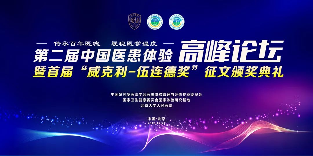 2019年12月27日,由中国研究型医院学会医患体验管理与评价专业委员会、国家卫生健康委员会医患体验研究基地、北京大学人民医院共同主办的第二届中国医患体验高峰论坛在京召开。同时,首届中国Wakley- Wu Lien Teh Prize(威克利—伍连德奖)正式揭晓,合力唱响“健康中国”、“健康世界”主旋律。国家卫生健康委医疗管理服务指导中心翟晓辉副主任,中国研究型医院学会名誉会长秦银河教授,中国研究型医院学会何振喜会长、刘希华副会长,《柳叶刀》杂志亚洲执行主编王辉女士,北京大学法学院孙东东教授,中央电视台中国电视剧制作中心编剧、制片人徐萌女士,清华大学人工智能研究院、网络行为研究所副所长杨斌莅临大会。北京大学人民医院院长姜保国,副院长张俊,党委副书记陈红松、郭静竹参加会议。各位嘉宾与各行政单位、各医院、行业科研协会、媒体领域的管理者、行业专家以及患者代表450余人齐聚一堂,共同针对医患体验这一全新视角进行深度阐释与探讨。