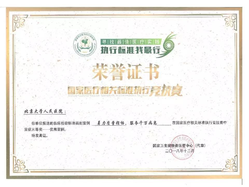 2018年12月15日,由国家卫生计生委医疗管理服务指导中心主办,国家卫生计生委法制司、医政医管局和宣传司指导,由《健康报》社、人民卫生出版社、中国医院协会等协办的首届《国家医疗相关标准执行竞技赛》中,北京大学人民医院检验科提供的案例《着力质量指标,服务千万病患》进入决赛,获得三等奖,“优秀案例”称号。