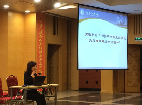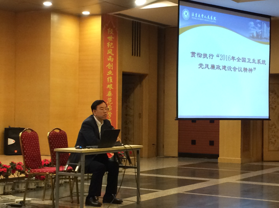 2016年4月18日,北京大学人民医院召开贯彻执行“2016年全国卫生系统党风廉政建设会议精神”专题学习会。进一步学习贯彻2016年卫生计生系统党风廉政建设及反腐败工作要求,分析医院党风廉政建设工作形势,并就做好2016年党风廉政建设工作提出要求。