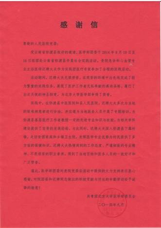 2014年7月23日至30日,医学部团委组织开展赴云南省暑期社会实践活动。北京大学人民医院团委副书记、急诊科迟骋医师参与了本次实践活动。实践中,迟骋跟随实践团与弥渡县政府领导进行了深入座谈交流,并先后参观了县中医医院与人民医院,与医院负责人共同探讨了我国基层医疗卫生的发展状况。此外,实践团深入到弥渡县村镇,走访贫困家庭和乡镇卫生院,为贫困家庭带去粮油等生活必需品。在此次实践活动中,迟骋医生以极大的热情和高度负责的精神投入其中,得到了当地医院和医学部团委的认可。医学部团委发来表扬信,对迟骋医师在活动期间无惧艰苦,出色地完成了较为繁重的实践任务表示了充分的肯定。