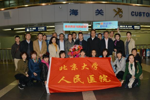 北京大学人民医院王杉院长、陈红书记、魏来副院长、赵越副书记,党院办邵晓凤主任、张瑾副主任,急诊科朱继红主任、王传林副主任、孙红护士长、赵礼婷护士长等急诊科同事及曹大夫家人一起到机场送行。王院长与陈书记不断叮嘱曹大夫注意安全,有任何问题都要及时跟医院联系,医院是永远的“大后方根据地”。急诊科党支部精心制作“曹叔西征马到成功!”、“宝剑出鞘、平安归来”的标语牌为曹大夫打气鼓劲,象征平安的“护身符”代表着全科人对他美好祝福。曹大夫妻子表示知道丈夫此行的危险,但更了解他的责任重大,家人全力支持,只希望他能平安归来。曹大夫说,医院在物资准备、培训等各项工作安排都十分周全,科里对自己也十分支持和关心,非常感谢医院的信任和关心,一定不辱使命,圆满完成此次任务!