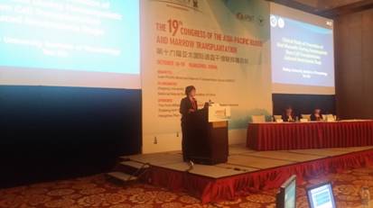 2014年10月16-19日,第19届亚太国际造血干细胞移植会议在杭州召开,超过1000名来自全亚洲乃至全世界血液学及造血干细胞移植学的专业人士出席了此次会议。北京大学人民医院血研所黄晓军所长受邀与浙江大学血液病研究所的黄河副所长共同担任此次大会的主席,并在大会上进行了以“Allo-HSCT can improve the clinical outcome for high-risk t(8;21) AML”(《异基因造血干细胞移植可改善高危型t(8;21)急性髓性白血病的临床预后》)为主题的发言,介绍了医院血研所利用分子标记技术,预先筛选出t(8;21)急性髓性白血病高危患者,并通过造血干细胞移植降低其复发率,改善患者生存的研究成果。颜霞科护士长受邀作为演讲嘉宾出席了本次会议,在18日的护理专场会议中进行了题为“Comprehensive prevention strategy can decrease the risk of oral mucositis during allogeneic hematopoietic stem cell transplantation”(《综合预防策略可有效降低造血干细胞移植相关口腔黏膜炎的发生风险》)的英文汇报,介绍了医院血液科多年来在造血干细胞移植粒缺期患者口腔黏膜炎预防和护理方面的宝贵经验。