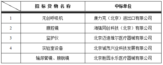 我院于2018年12月14日对以下医疗设备进行院内招标,中标结果如下: