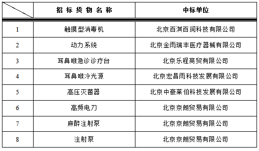 我院于2019年3月22日对以下医疗设备进行院内招标,中标结果如下: