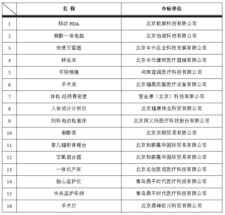 我院于2022年12月21日对以下医疗项目进行院内招标,中标结果如下: