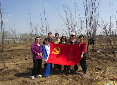 经过一段时间车程,大家来到曹刘各庄村。这是通州区县的一个自然村,环境整洁,空气清新。植树活动在大家的欢声笑语中开始了。以前总以为种树是件很容易的事情,没想到真的实践起来还是很有学问的。在工作人员的示范下,大家很快掌握了种树要点,两人一组,挥锨铲土,栽种浇水,既分工协作又配合默契。有的老师有种植经验,树坑挖得又深又好,引得大家惊羡不已,植树现场洋溢着欢乐的笑声。很快,十几棵小树苗就在树园里安了家。“照相了,发微信啊”随着一声招呼,大家纷纷来到小树苗前拍照留念。鲜红的党旗、幸福的笑容,在镜头中定格成永远。